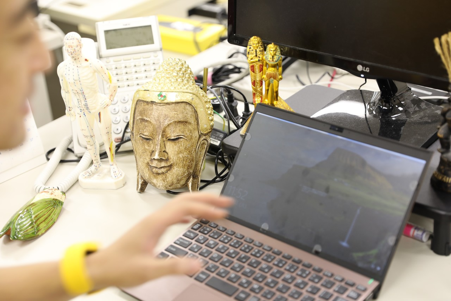 海外によく行く石田さん。デスクの上は各地のお土産が並んでいてとても賑やか。一番左にあるのはセミのLEDライト。スイッチを入れると鳴きます。