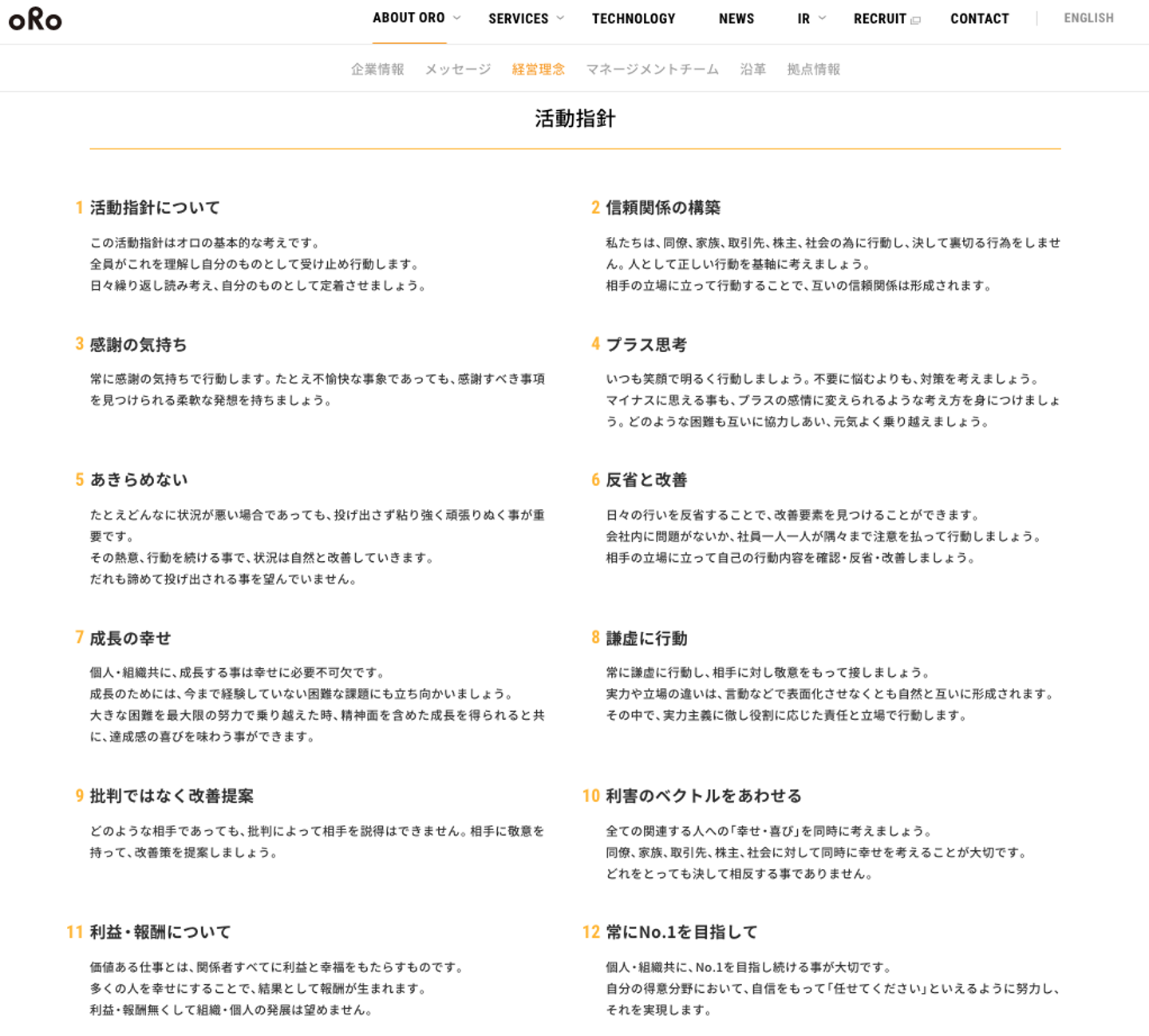 基本的な日々の考え方としてオロが定めている12個の指針。10年間オロで過ごしていると自然な考え方として定着されているようです。