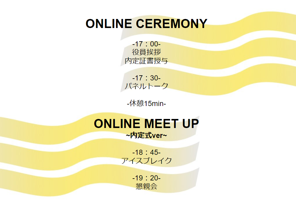 ONLINE CEREMONYでは例年内定式で実施してきたコンテンツ+オンラインならではのコンテンツで企画しており、