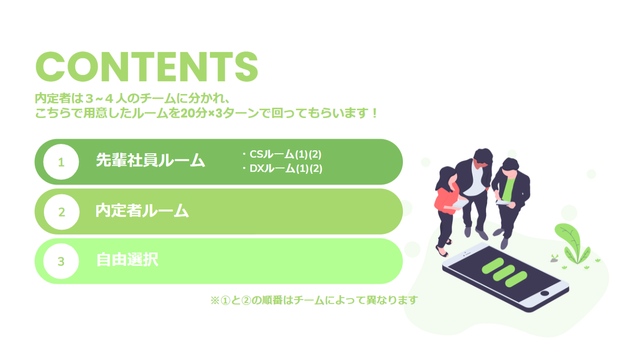 Zoomのブレイクアウトルームを使い、先輩社員と、同期同士で、それぞれ少人数でコミュニケーションできるコンテンツを企画しました。