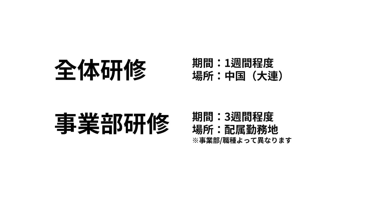 研修の内容は事業部によって、職種によって異なりますが、今回はその中から1部ご紹介していきます。