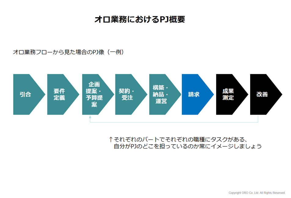専門的な基礎知識についても研修に組み込まれていますが、プロジェクトの構成要素についても大切な内容のため研修に組み込んでいます。(事業部/職種によって異なります)