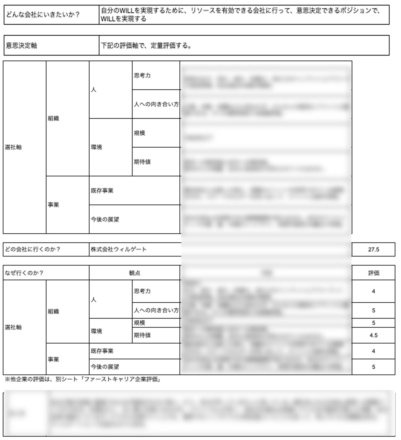 はい。結果として、ウィルゲートの他外資系戦略コンサル・外資系投資銀行や総合商社などの様々な企業からオファーを頂きました。そこで、自身で全6項目各5点満点の定量評価を行い、一番スコアが高かった企業に行くことにしました。そこで一番点数が高かったのがウィルゲートだったんです。