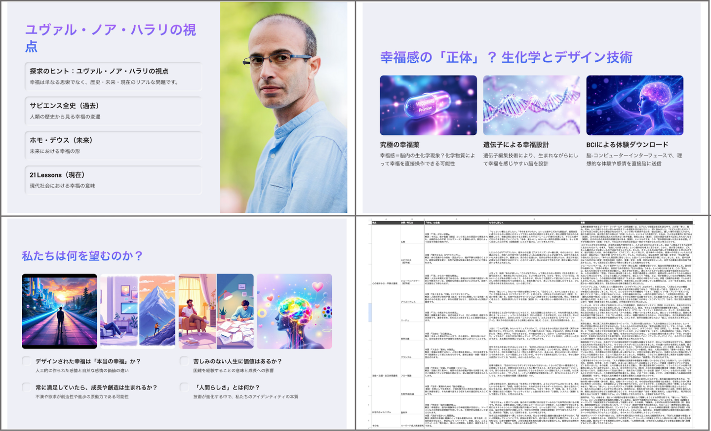 ユヴァル・ノア・ハラリ氏の視点を起点に、「幸せとは何か?」という根源的な問いを、歴史や哲学に加えて、最新の科学技術の視点から深く考察したプレゼンです!