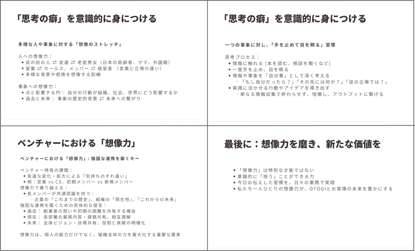 メタ認知を深めるステップ(いろんなことを知る、価値観を深めるなど)を提示し、「人生と人間性を豊かにする」という目標のための、OTOGIの普遍的な「公理(行動原則)」を言語化。これにより、組織全体の目線を合わせる重要な土台を再確認できた時間でした。
