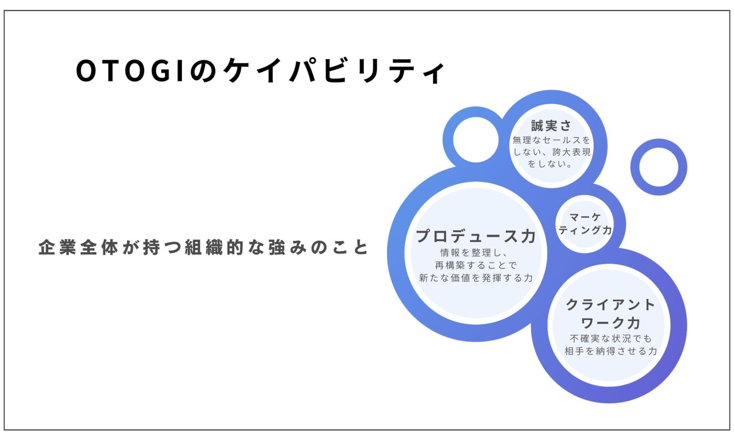 OTOGIが組織として持つケイパビリティ(強み)の一つに「プロデュース力」があります。これは「情報を整理し、再構築することで新たな価値を発揮する力」です。