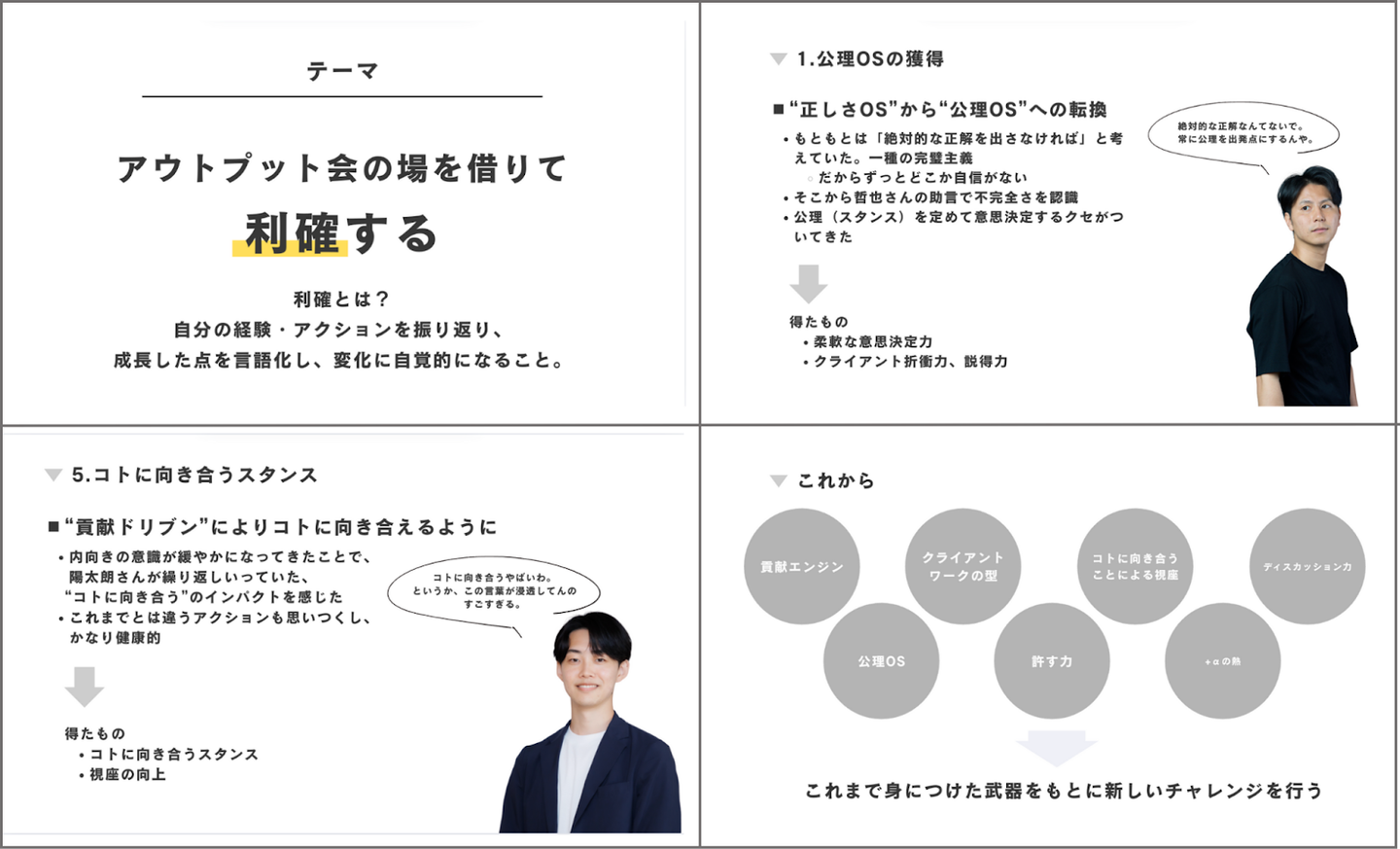 「利確」を「自分の経験やアクションを振り返り、成長した点を言語化して、自分自身で自覚すること」と定義しました。具体的な成果である「獲得したスキル」や「変化したスタンス」を共有し、内省と成長を言語化することの大切さ、そしてそれを踏まえてこれから挑戦したいことについて熱く語りました。