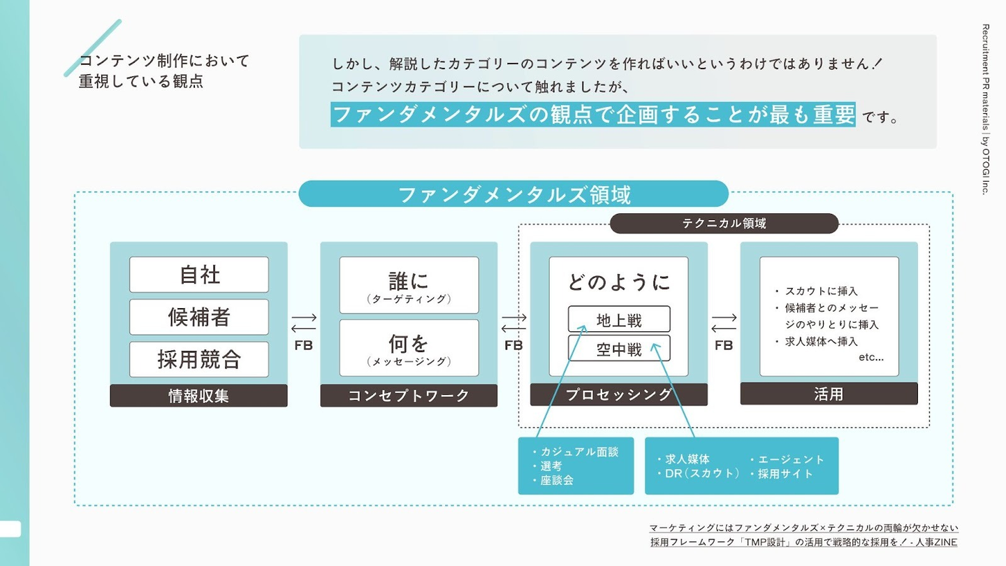 OTOGIでは、この考え方を、金融用語になぞらえて「ファンダメンタルズ」と表現しています。本来、ファンダメンタルズとは企業の財務や業績といった「実態的価値」を見極めることを指します。採用広報においても、「どう表現し、どう届けるか」ばかりを追うのではなく、「誰に、何を、なぜ届けるか」という土台が置き去りになっているケースが多く見受けられます。