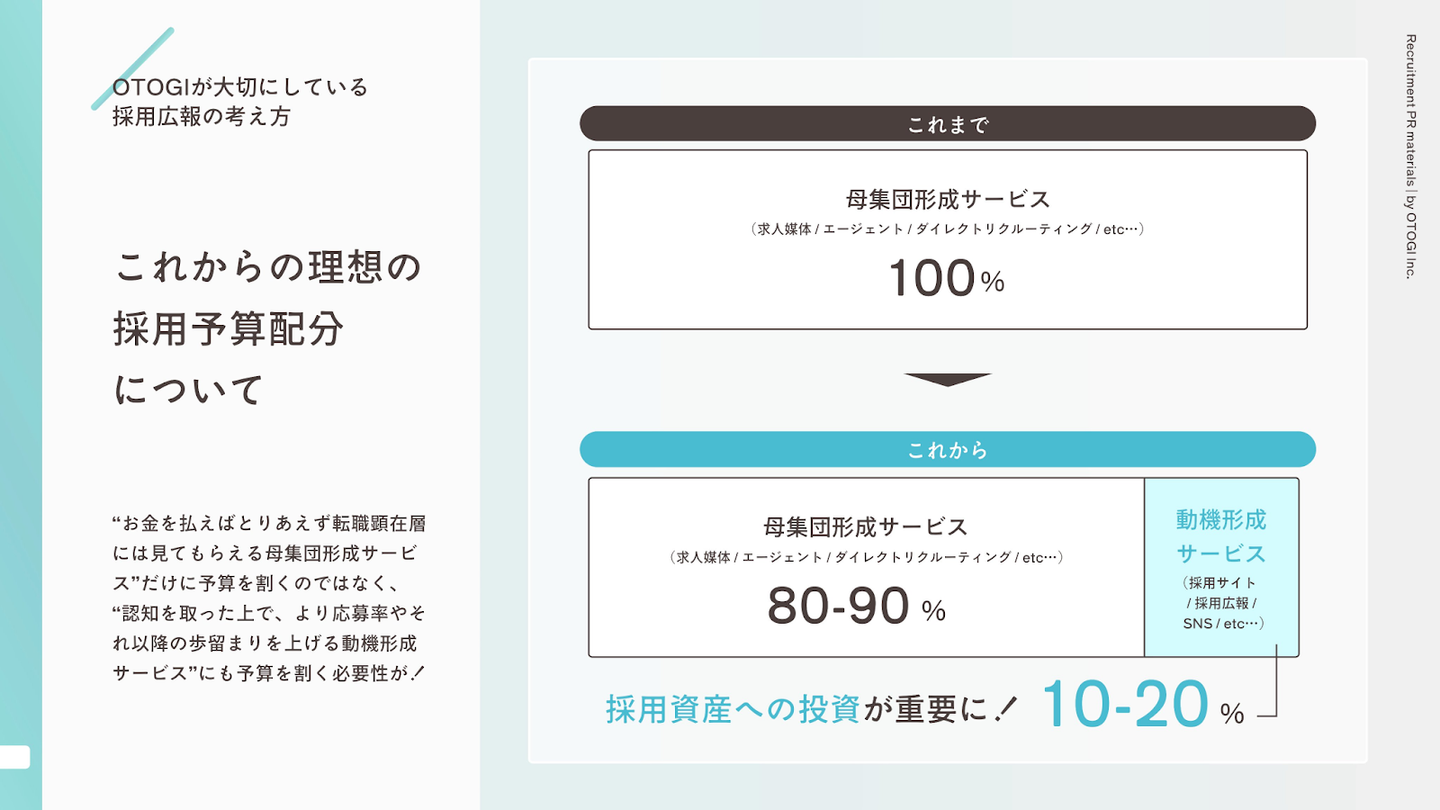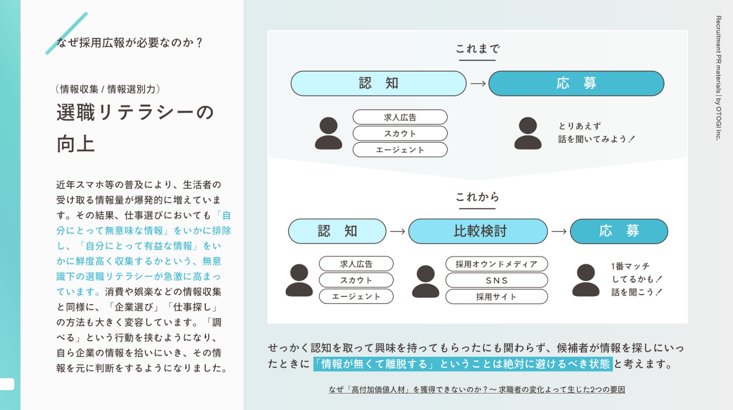 ただし、市場の認識を変えずして、この未来は実現できません。OTOGIに振り向いてもらう以前に、採用広報の重要性を市場に浸透させる必要があります。