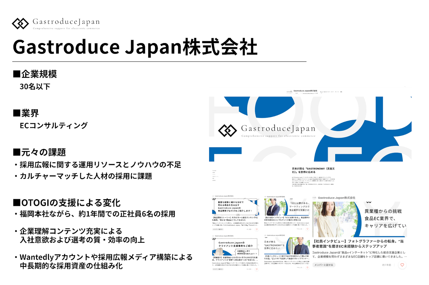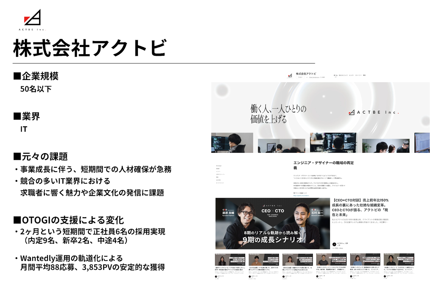 OTOGIでは、Wantedly運用代行事業において、このコンテンツの力によって単なる求人だけの運用による人数増にとどまらない採用課題の解決を実現してきました。企業理解の深度が鍵となった、インパクトの大きい採用成功事例を紹介します。