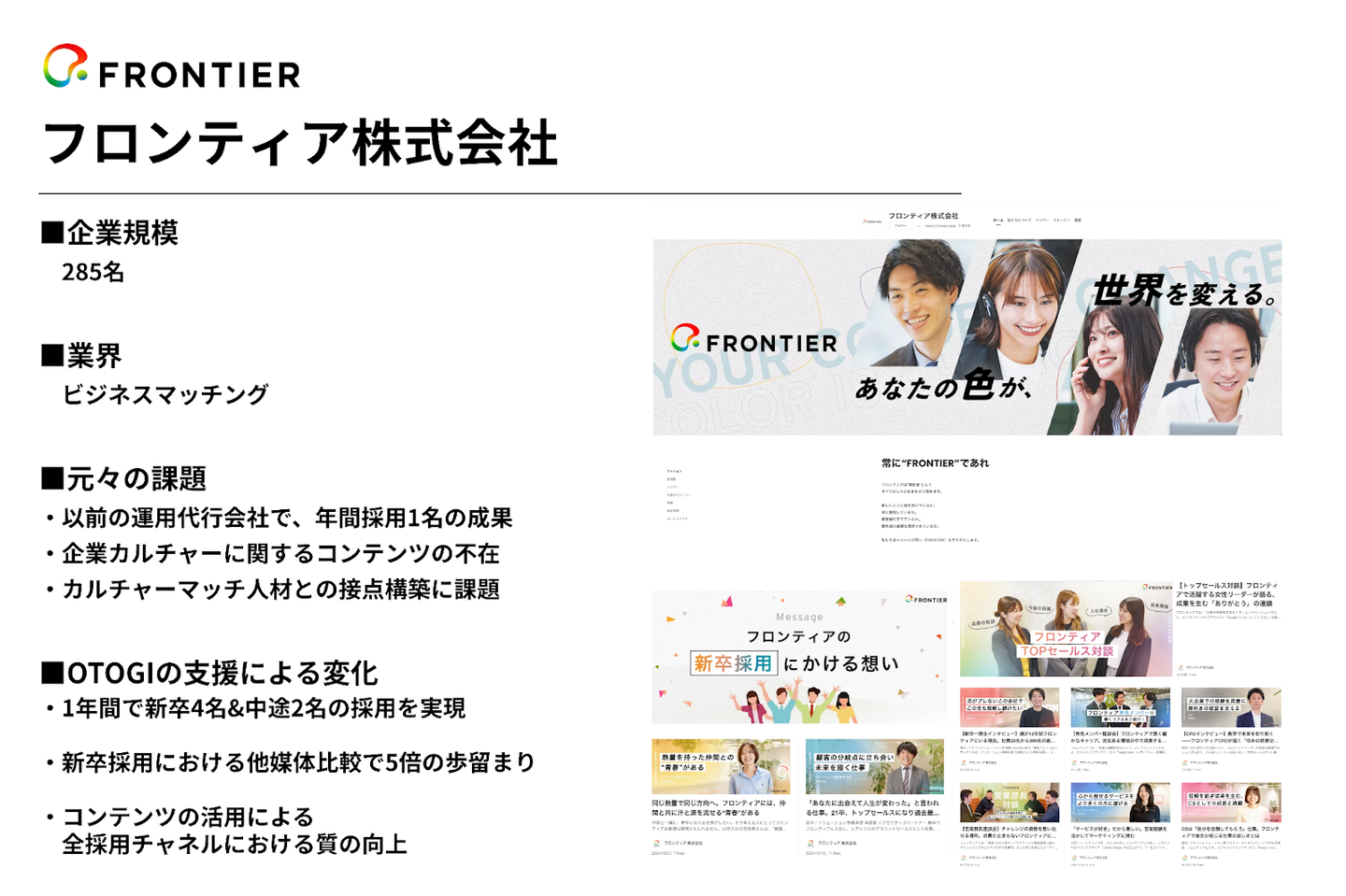その中で、採用市場を熟知している採用代行会社がコンテンツ作成に強いOTOGIのサービスを名指しで紹介してくれるようになったことは、「採用広報の時代が来た」という何よりの確信となりました。
