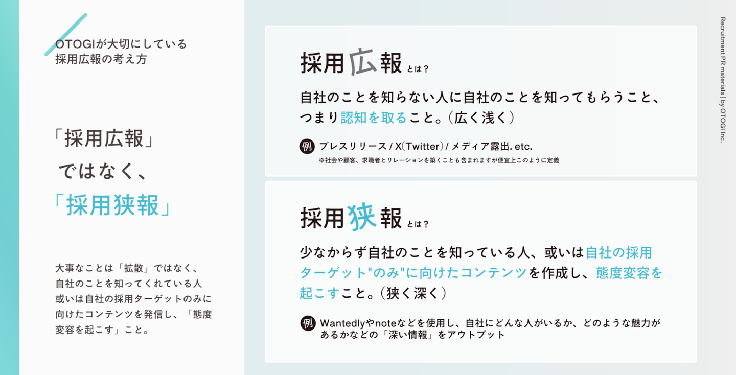 またOTOGIが提唱する、目先のPV欲しさのための背伸びコンテンツを作らない採用狭報にも通ずる考え方となります。採用広報は炎上リスクも伴う公の活動であるからこそ、小手先の手段に走らず、真摯に企業と向き合う責任感が求められます。