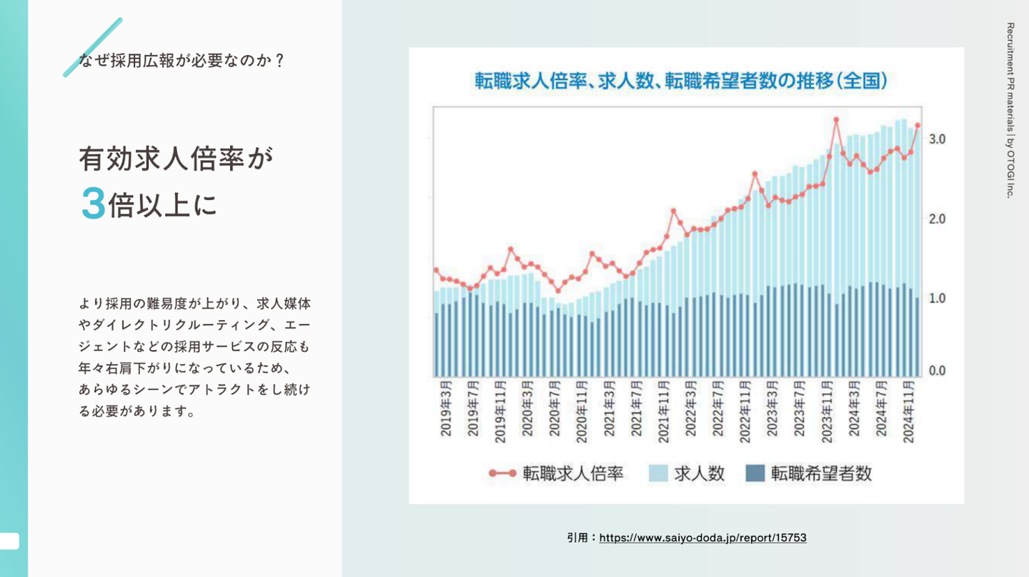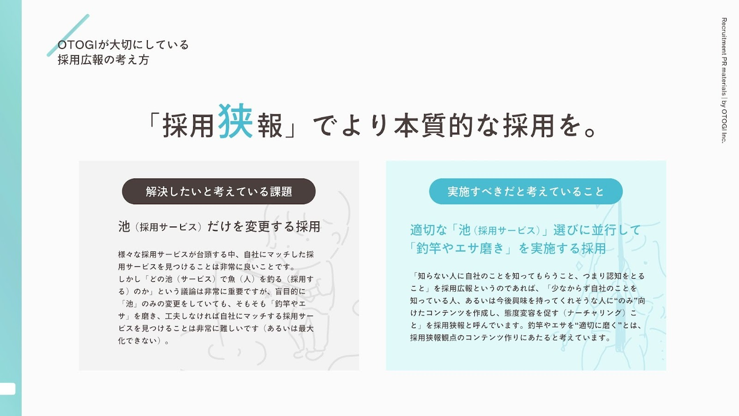 私たちOTOGIは、「採用狭報を採用のスタンダードに。」というミッションのもと、日本の労働力人口減少と激化する人材獲得競争という企業が直面する課題に対し、“採用狭報”という概念で向き合い続けています。
