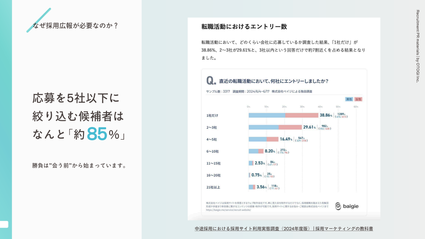 この事実は、候補者が仕事を選ぶ側であることを明確に示しており、企業は選ばれる存在となるために、単に情報を公開するだけでなく、候補者に対して魅力を感じてもらうためのアトラクトを継続的に行う必要があります。