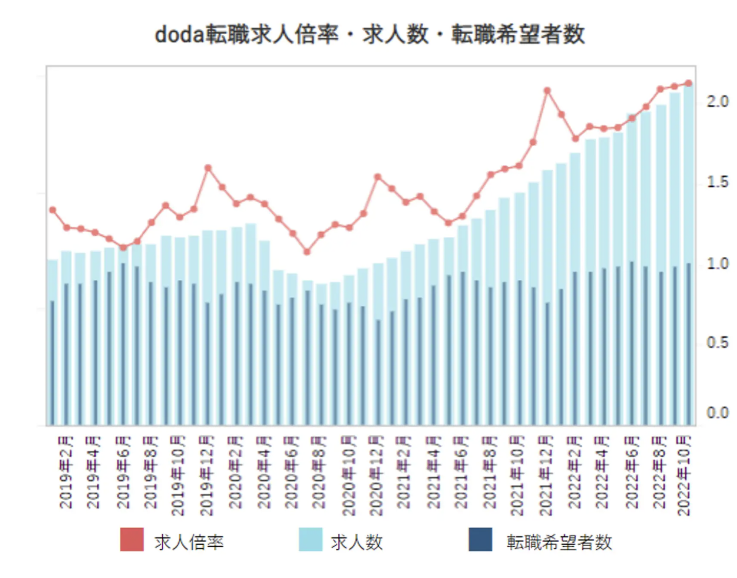 まずは大前提として、日本が直面する(既にしている?)労働力人口問題。図にもある通り、右肩下がりに大幅減少すると言われています。また、それに伴い2022年10月時点ですでに求人倍率は2.13倍を記録しています。求人、つまり仕事の数に対して、転職を考えている人はその半分以下しかいないという事実。人材サービス、コンサルティング、IT・通信業界などは約6-7倍前後を推移しており、本当にぞっとする数字となっています。
