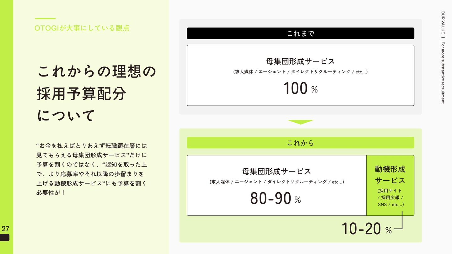 OTOGIは本気で「採用狭報支援といえばOTOGI」という第一想起を狙い、「採用狭報を採用のスタンダードに」というミッションを叶えにいきます。