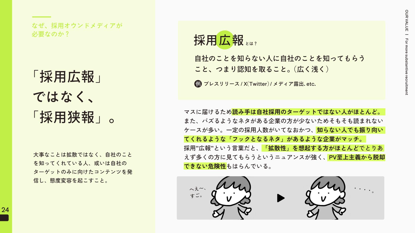 一方で採用狭報は、何かしらで自社のことを知っている方や今後候補者となりうる方にのみ向けたコンテンツを作っていくため、基本的にはどの企業もできるし、最低限はやっておいた方がよい施策でまさに、“竿や餌を磨く行為”だと認識しています。