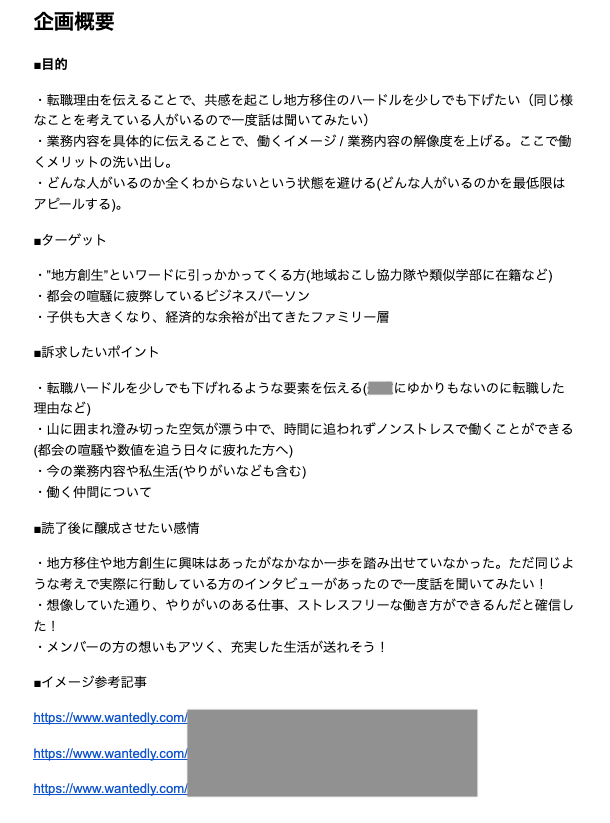 上記のようなものを設定した上で何を聞いて何を聞かないのか?ということを決めていくため、インタビューでありがちな「結局何を伝えたい記事なのかわからなくなる」ことを未然に防ぐことができます。