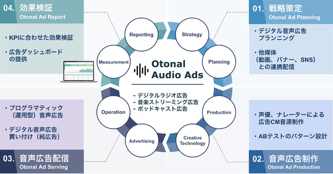 オトナルは、広告主向けの「デジタル音声広告提案」と、メディア企業向けの「音声配信・音声アドテク支援」の両面を通じて、音声市場の発展をリードしています。