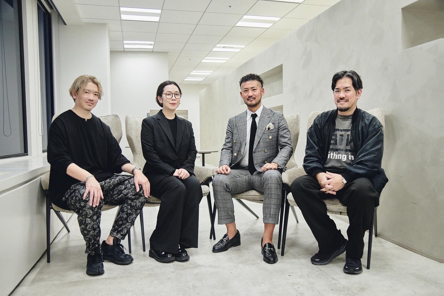 【対談メンバー|プロジェクトメンバー】左からクリエイティブプロデューサー 今川雅幸(OVERA) ストラテジスト 辻原 咲紀(OVERA) マテリアル取締役 関 航さん アートディレク