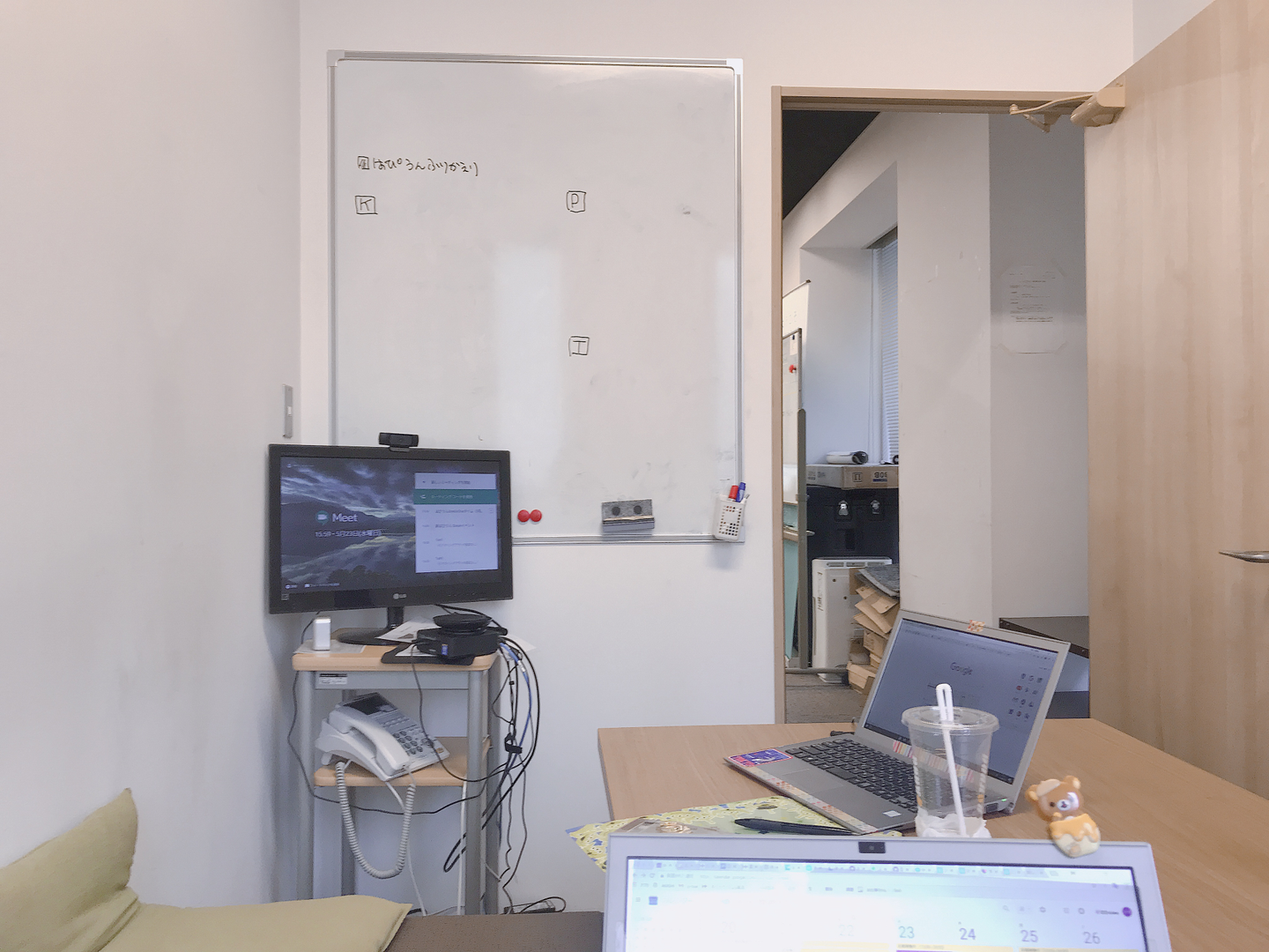 毎朝10時には2階の中央テーブルにて全社朝会が行われます。この時間は9時半くらいですが、10時になると全社員がここに集まります。もちろんリモート勤務の社員もgoogle meetを使って朝会に参加することが出来ます!入社の初日に朝会が一番の衝撃でした。←かっこよくて(*´∇`*)