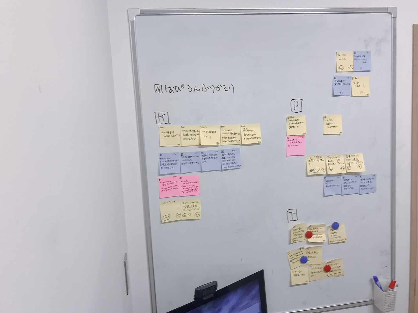 毎週火曜日は会議の日!ハピタス運用チームでは毎週火曜日「はぴうんスクラムイベント」が行われています。はぴうん振り返りとも言いますが、みんなで一週間を振り返ってみて、KPTということを語り合います。KはKeep、今週これは良かったということやこれからも持ち続けてほしいことを共有します。PはProblemで、これからの課題を出します。ただ、反省は大丈夫だけど自分が悪かったとか、他人が悪かったなどのネガティブな発言はしないようにします。私はこのルールがとても好きです!(o^-')b!最後のTはTryです。Pの課題に対してこれから直してみる提案をみんなで考えてみることです。期限はもちろん自分で決めて、期限になったらまたスクラムイベントでその結果を共有します。