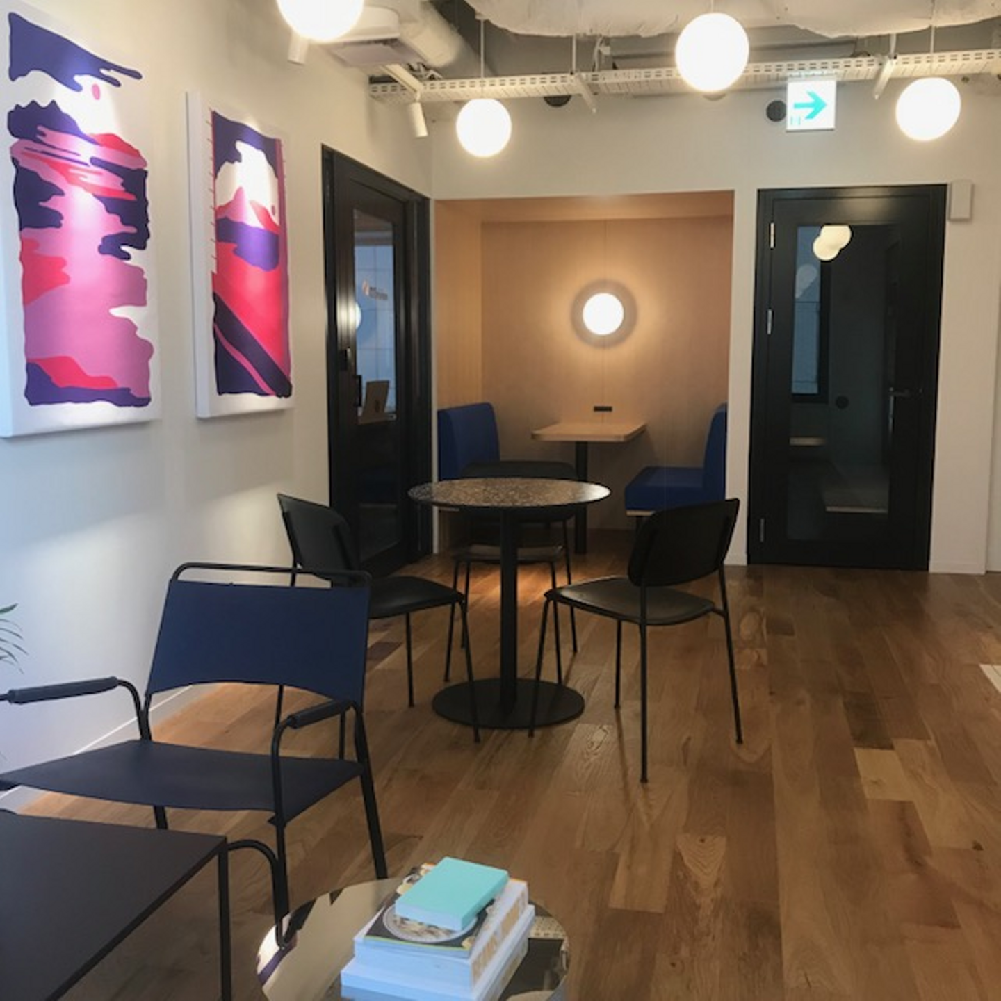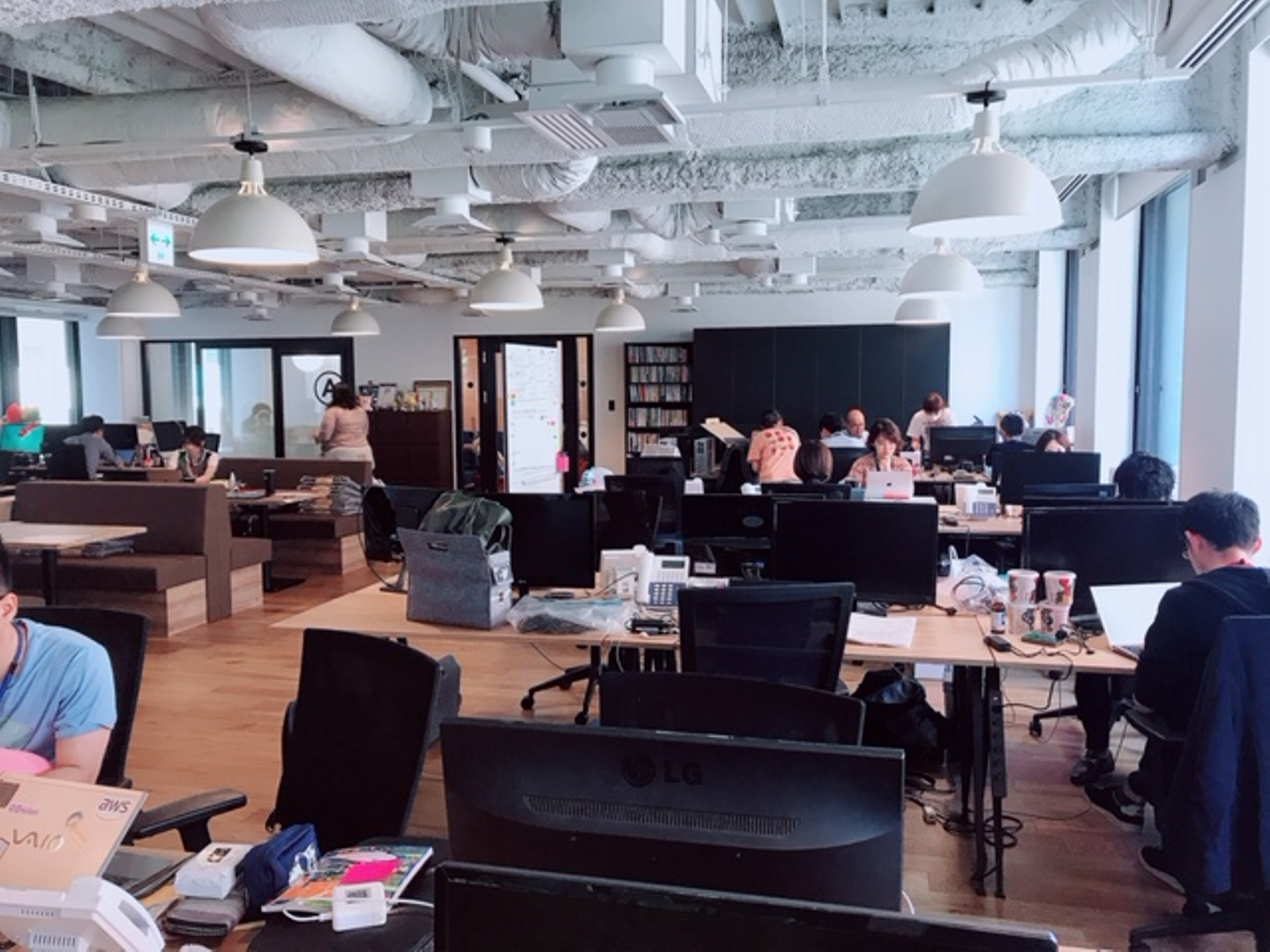上の写真から左側にあるドアを開けるとオフィスがあって、右側に見えるドアは電話や個人業務ができるプライベート的な場所もあります!私は集中ができないときに使うようにしてます。