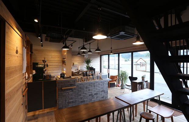 壁は飫肥杉の下見板張りを白塗装し、床には足場板を敷いた。カウンター横のテーブルはカフェスペースとして、淹れたてのコーヒーを楽しむことができる。