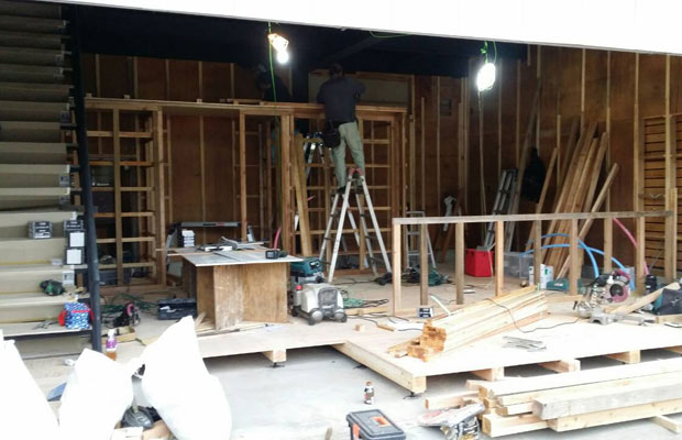 工事中。シャッターを開けると玄関もない、がらんどうの空間だったため、すべてを一からつくることに。