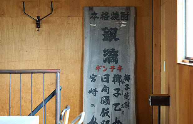 倉庫にあった焼酎の銘柄〈銀滴〉の看板。解体時に廃棄するのがもったいなく、いまでも大事に事務所に飾っている。