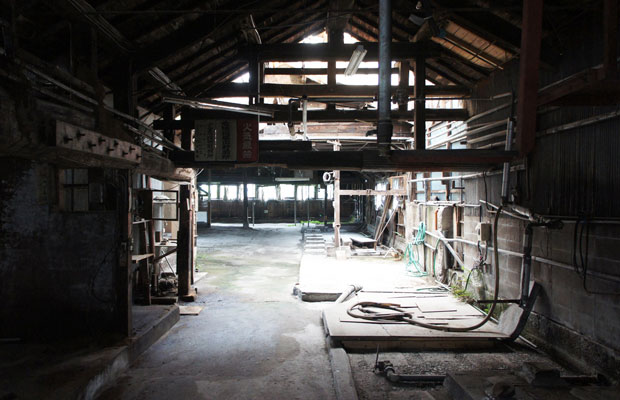 別棟の元酒造の内観。現在は取り壊されて駐車場になっている。菌がついた柱や梁が印象的。