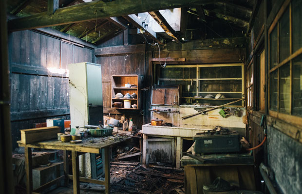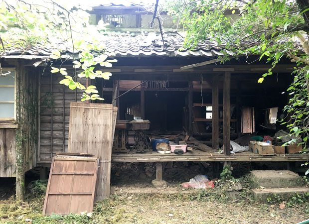 既存の外観。内部にあった不要な家財道具を撤去している様子。
