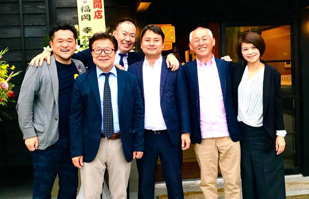 オープン時、仲間から祝福を受ける本田清大さん(右から3番目)。