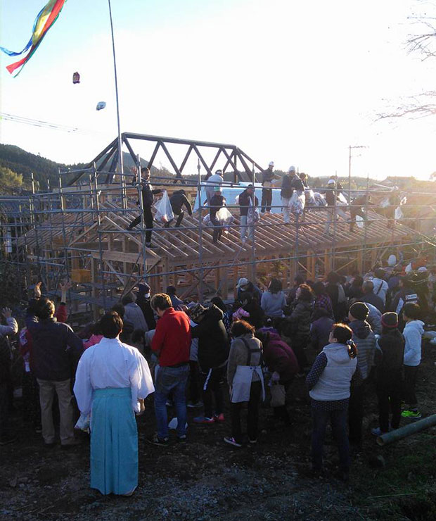 上棟式の風景。完成を待ち遠しく思う近隣の方々が餅まきに参加し、多くの人が集まった。