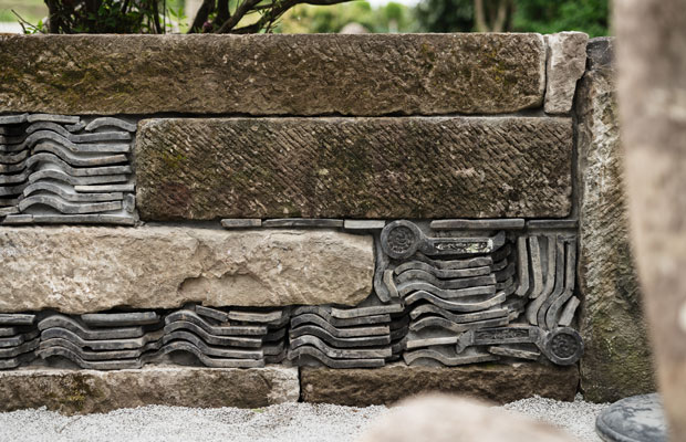 庭に新設した石垣。以前使用されていた瓦を石垣の間に入れ、歴史のかけらを敷地内に残す。