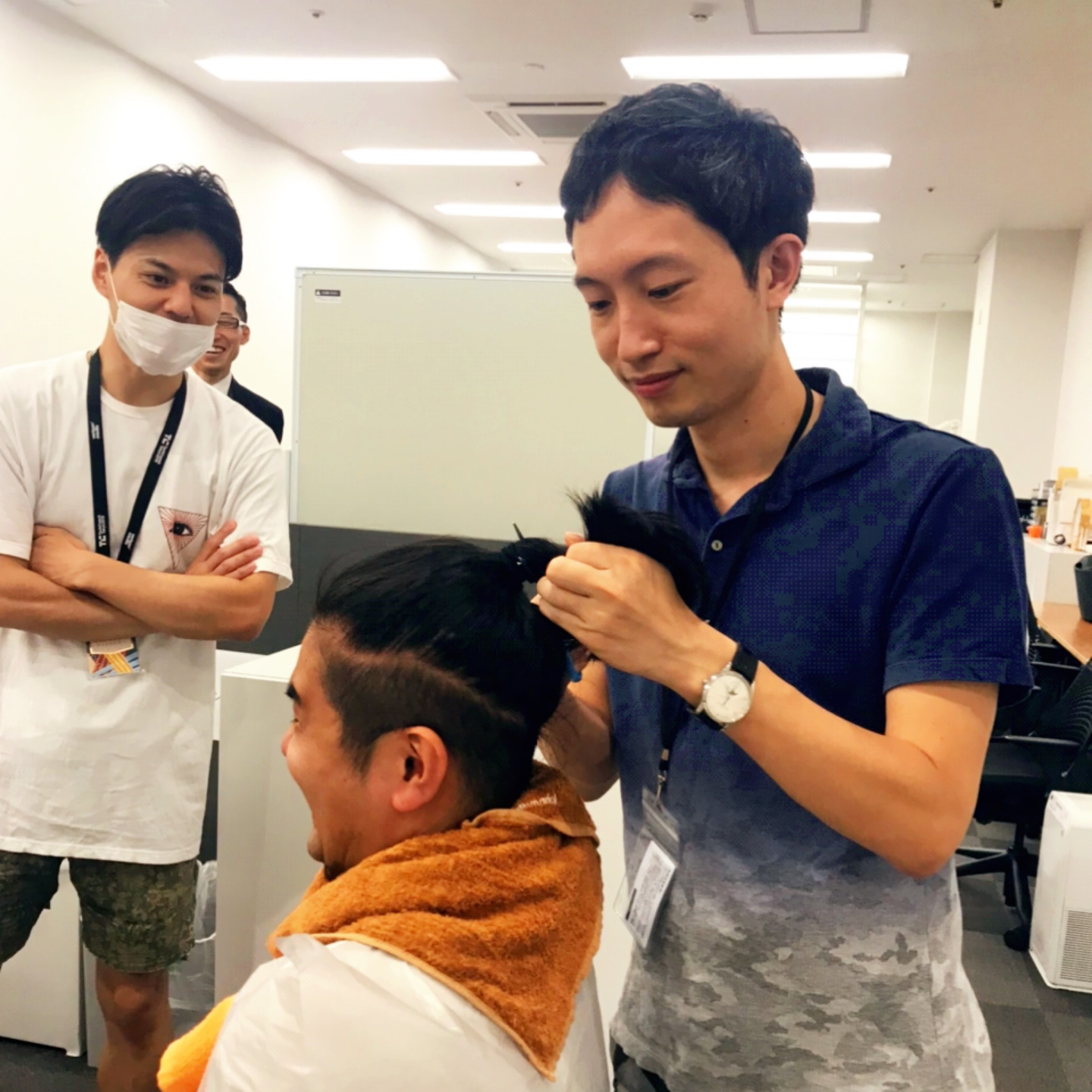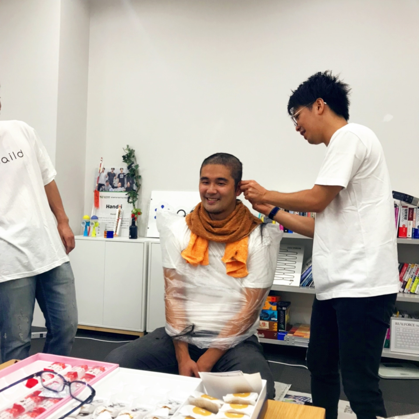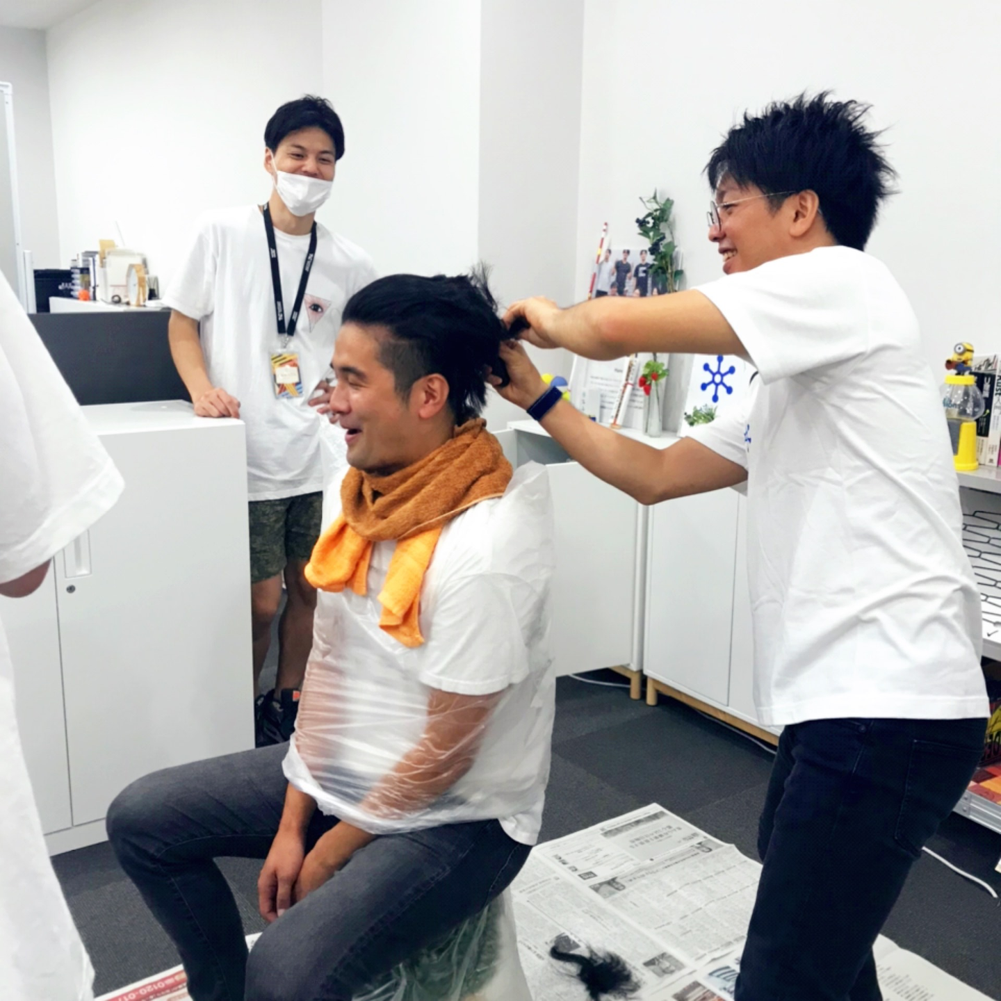さて、やってきた断髪式当日は、採用のための写真を撮影する日でもありました。リモートワークを実施中の弊社ですが、撮影のためオフィスにメンバーが集まってきました。まずは、新聞紙をひいて森にビニールを被せ(散髪マントっぽく)、準備完了。