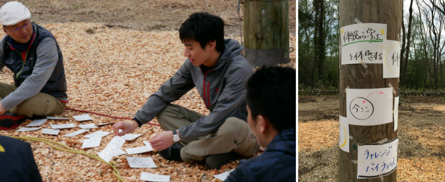 こちら側からあちら側へロープを使ってグループ全員が渡っていく「川わたり」。制限時間は30分。声かけが起きたり、役割が固定したり、ちょっとした成功が嬉しかったり・・。
