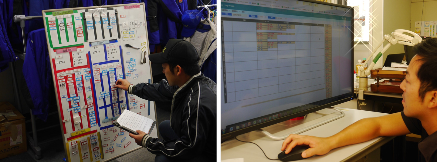 左:手書きのホワイトボードの記入作業は属人的で、就業後に1時間もかかっていた 右:ホワイトボードがシステムを使ってデジタル化されたことで、作業時間が半分に短縮