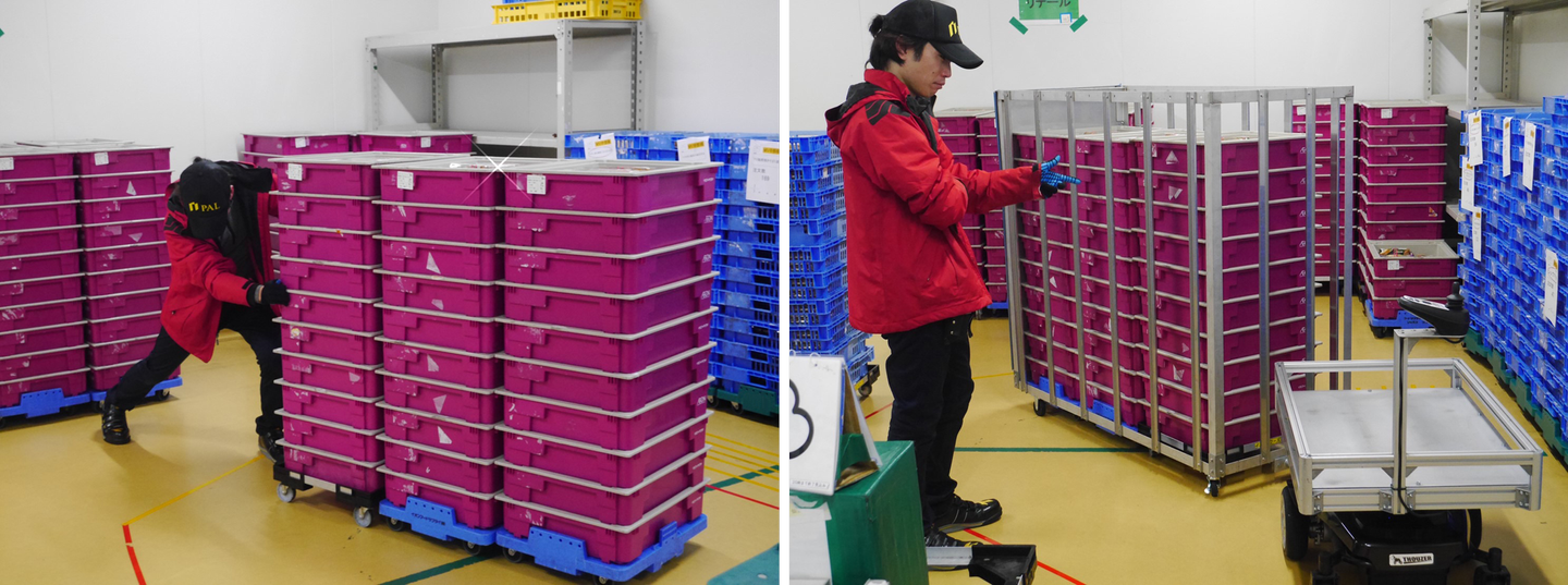 左:以前は人が運搬作業を行っていた 右:AVG導入後は機械が自動で搬出作業を行ってくれるため、確認作業のみでよい