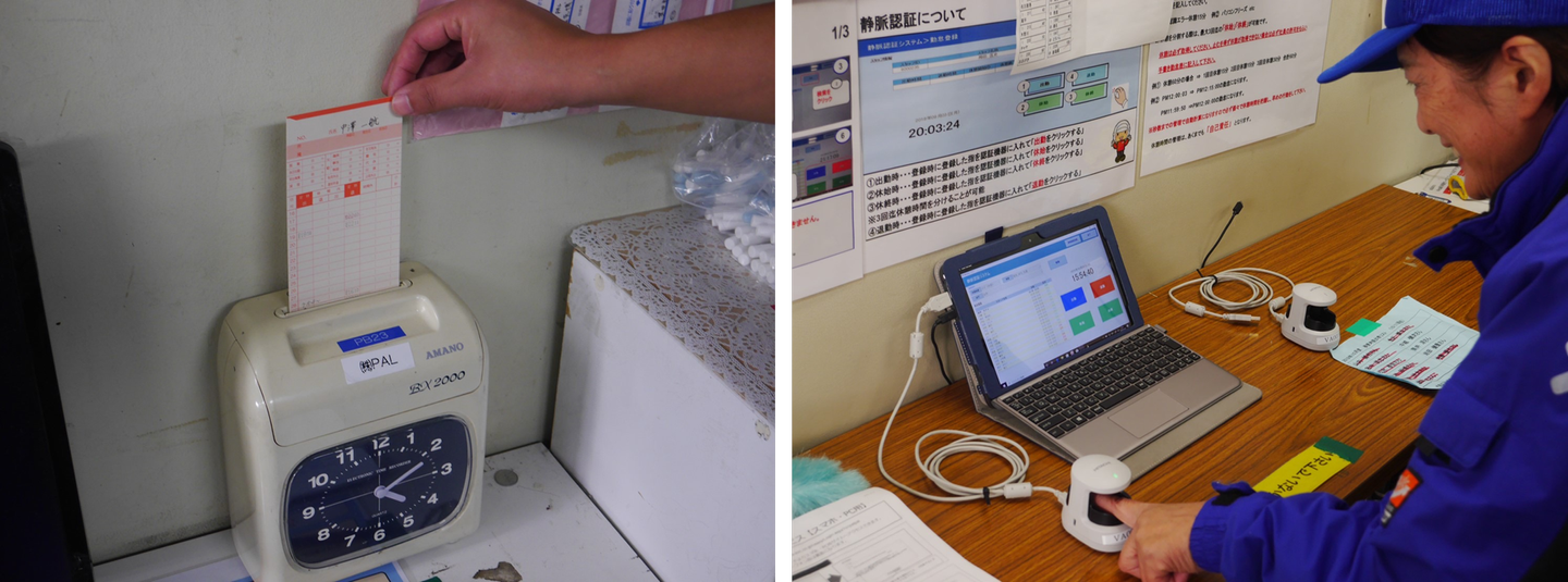 左:かつてはタイムカードを利用していた 右:静脈勤怠では指一本で簡単に打刻ができ、後工程である給与計算やホワイトボードのシフト配置につながっている