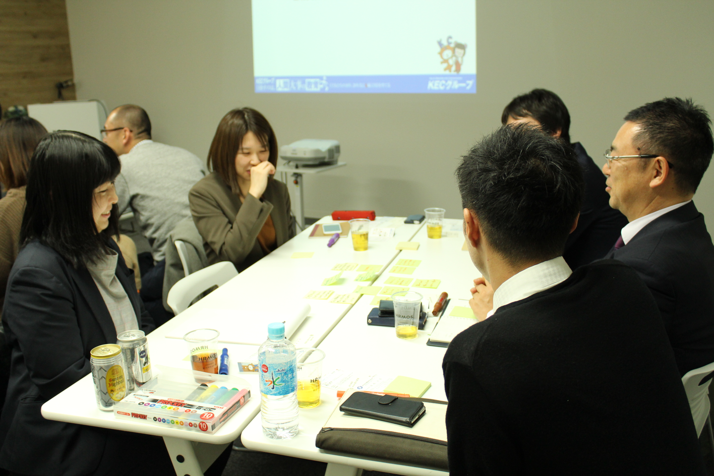 全員での乾杯の後、奈良から世界へ!教育で世界を変える!と理念を掲げられる株式会社KECの永持さんに「新卒のサマーインターンシップから本選考への参加率アップを目指した取り組み」をお話いただきました。KECさんならではの学生さんをわくわくさせる工夫には、目から鱗です!