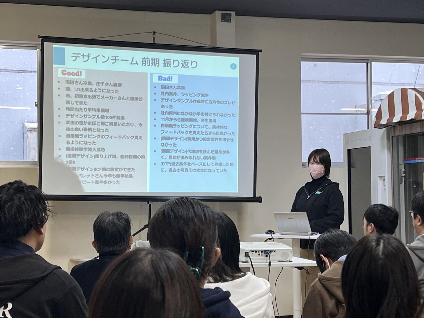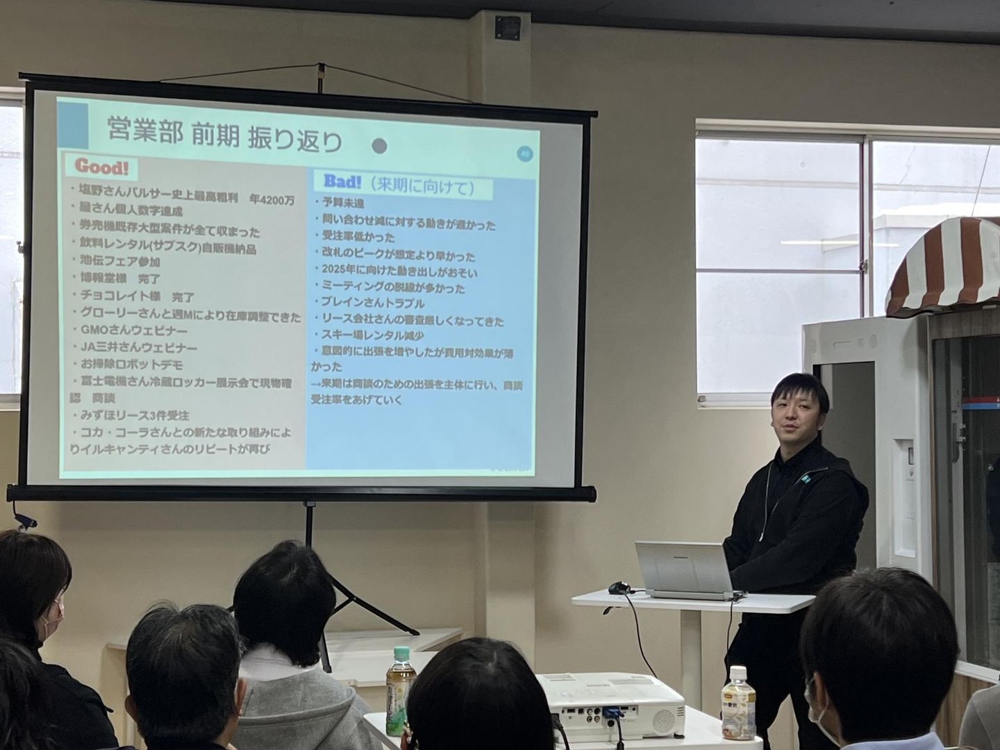 半期に1回、行われる全社の経営指針発表会。内容は、前半期を振り返り、次の半期の方針などは発表します。