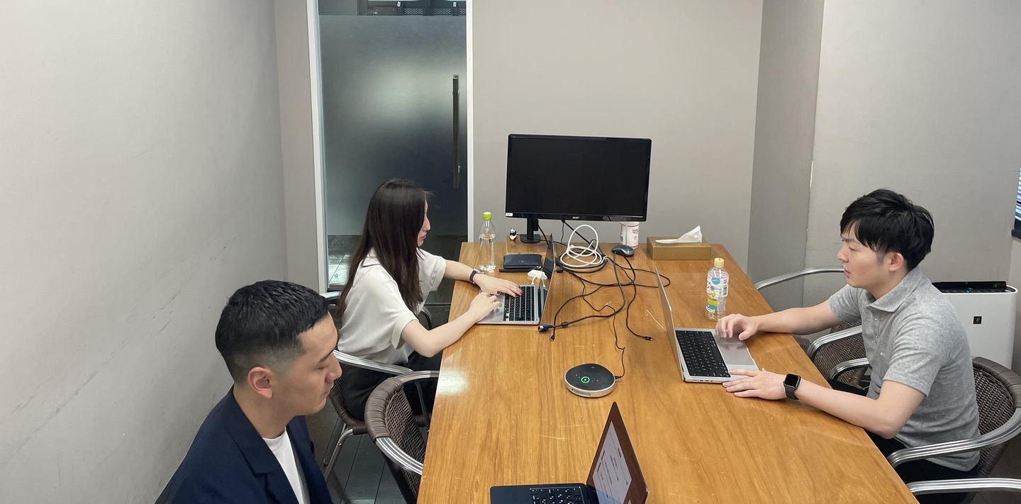 会議室に向かい合って座り、アイコンタクトを取りつつ進行、解説、開発担当と分担しながら進めます。機能開発時からビジネス部門、開発部門が一つのチームとして検討を重ねてきていますので、質問回答などでもチームワークが抜群すぎる!