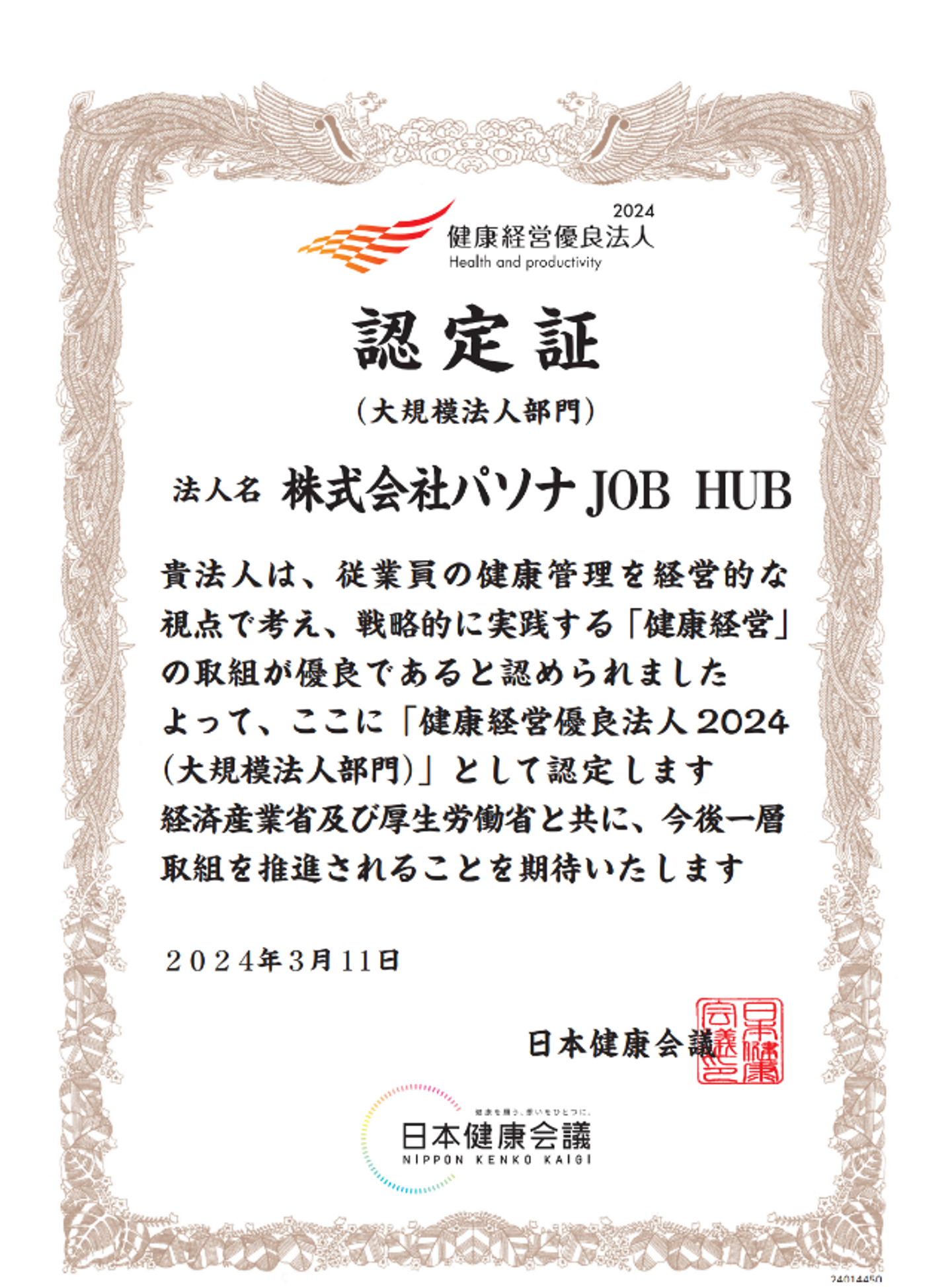 はい!パソナJOBHUBは今年3月に本認定を受けたのですが、親会社であるパソナグループ、パソナは、『健康経営優良法人(ホワイト500)』に8年連続で認定を受けています!加えて、グループ会社である、株式会社パソナ日本総務部は『健康経営優良法人2024(中小規模法人部門)ブライト500』、株式会社パソナHSは、『健康経営優良法人2024(大規模法人部門)』(弊社と同様)の認定を受けています。