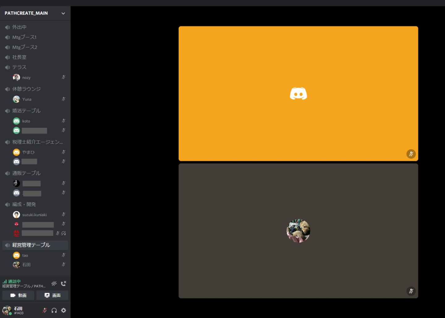 サーバーという大きなお部屋の中にチャンネルという小さなお部屋を作ることが出来るので、パスクリエイトでは「PATHCREATE MAIN」というサーバーを作り、その中に「執務室」・「ミーティングブース」・「社長室」などのチャンネルに加え、各事業部のチャンネルを作成し、コミュニケーションが取りやすいようにしてあります。