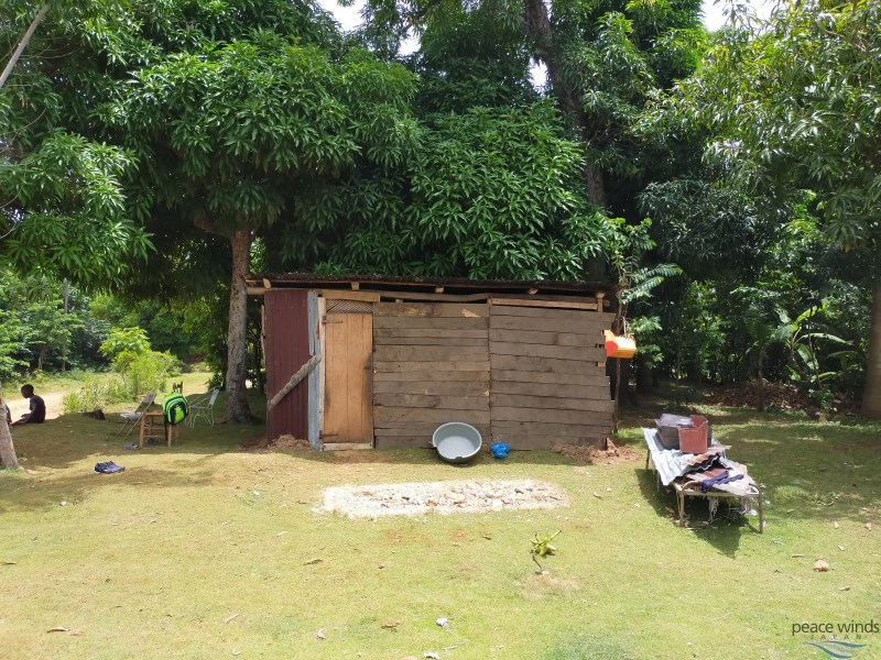 ③:地震発生時、Salexさんはレカイ市内にいました。帰宅すると、家が全壊していて言葉もでなかったそうです。息子さんが崩壊した家の一部を使って小屋を建て、屋根のある生活はできていますが、隣町に2時間歩いて水を調達しに行かなければならず、高齢のSalexさんには大変な労力となっています。