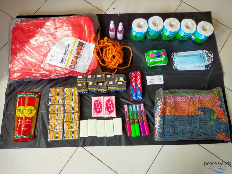 PWJはJPFからの助成による緊急初動調査中に、支援物資が行き届いていないトーベック地域で、地震により負傷または障害を持つことになった方を主な対象に、200世帯分の生活物資の配布を行いました。緊急物資キットは、ターポリン(ブルーシート)、ロープ、ブランケット、衛生用品(石鹸、洗濯石鹸、トイレットペーパー、歯ブラシ、歯磨き粉、生理用品、マスク、消毒液)、ミルク、スパゲッティー、ビスケットです。緊急物資の袋詰め作業には、被災者でもあるボランティアの女性達が協力してくれました。物資配布当日も、住民へ配布するお手伝いをしてくれました。
