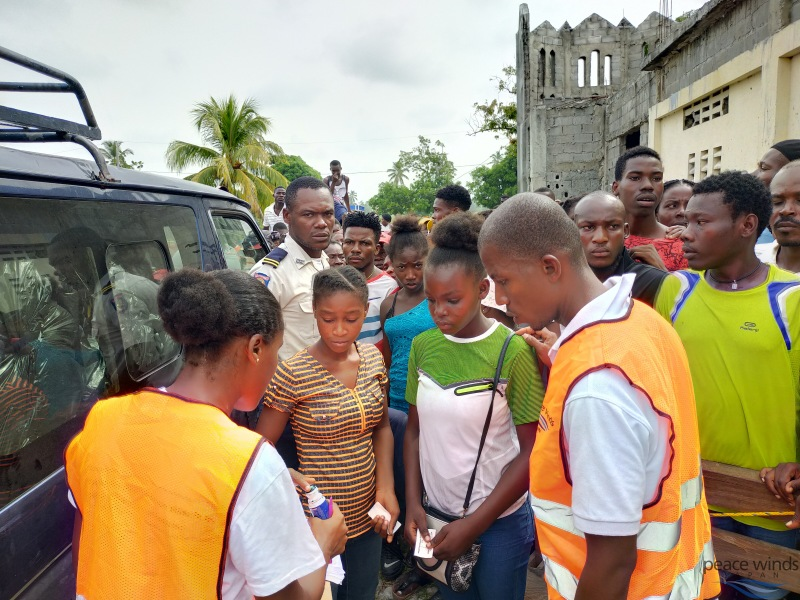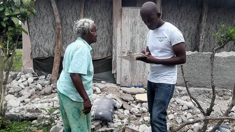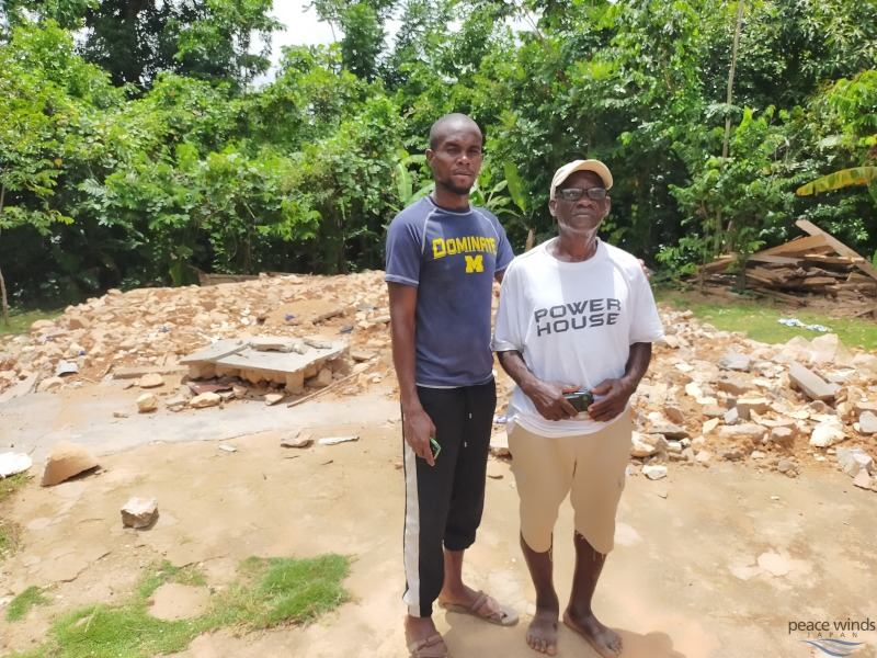 また、日々の被災状況の聞き取り調査を行っているPWJスタッフのマッケンソンをはじめとするスタッフも、被災者の一人です。スタッフ自身も、家族を失ったり、家が倒壊したりと支援が必要であるにも関わらず、毎日調査を実施してくれました。彼の地元である、トーベック地域も大きな被害を受けたと言います。8月のある日、彼の自宅近くに住む女性に聞き取り調査をしたところ、彼女は瓦礫の下で無意識になり倒れていたところ、地域の人々が何とか彼女の命を救ったそうです。彼は、日々調査を行う中で「地元の住民たちは本当に傷ついていて、希望を失ったかのような顔をしている」と話します。(⑦の写真)