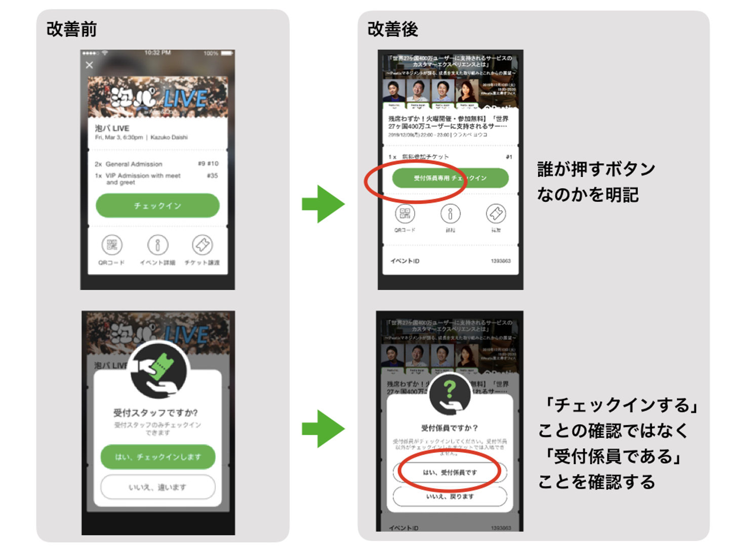 浦壁:そして2017年にできたのが「スワイプチェックイン」。チケット画面を指でスワイプして処理するものです。ところが、ちょっと指で触ると処理されてしまうので、テスト運用で参加者が誤って処理する事例が多発しました。そこで2本指でのスワイプにしたら、今度はすごくスワイプしづらくなってしまって……。また見直しを行い、画面に表示されるボタンをタップする「タップチェックイン」となりました。