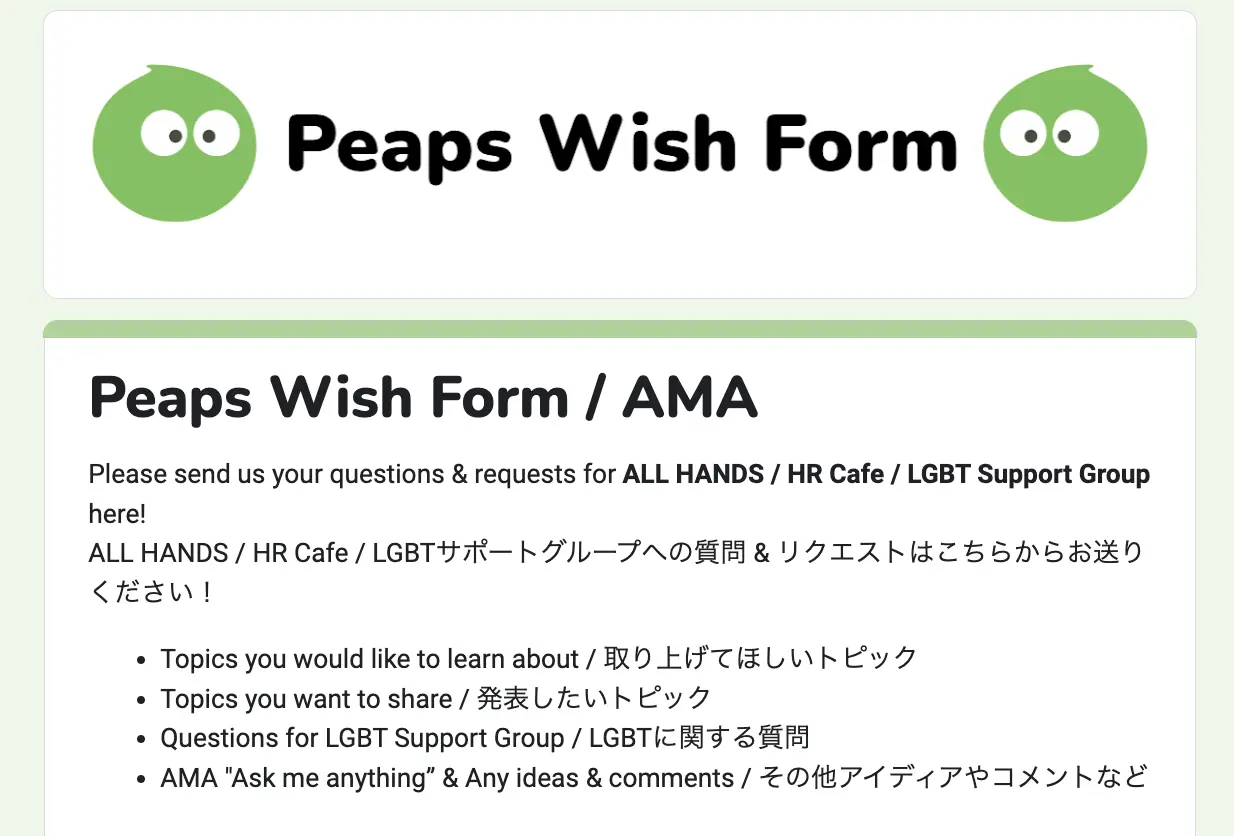 Peatixには世界8ヶ国のPeaps(私たちは社員のことを「Peaps」と呼んでいます)がいるため、リモートでのコミュニケーションが主となっていることや、直近2年弱で社員数が2倍に増えたこともあり、お互いの顔が見えにくい中でも心理的安全性を保つための取り組みを大切にしています。その中でも、毎週実施している「All Hands」という日本語・英語で行われる全社会議が特に評価され、今回の受賞に繋がりました。
